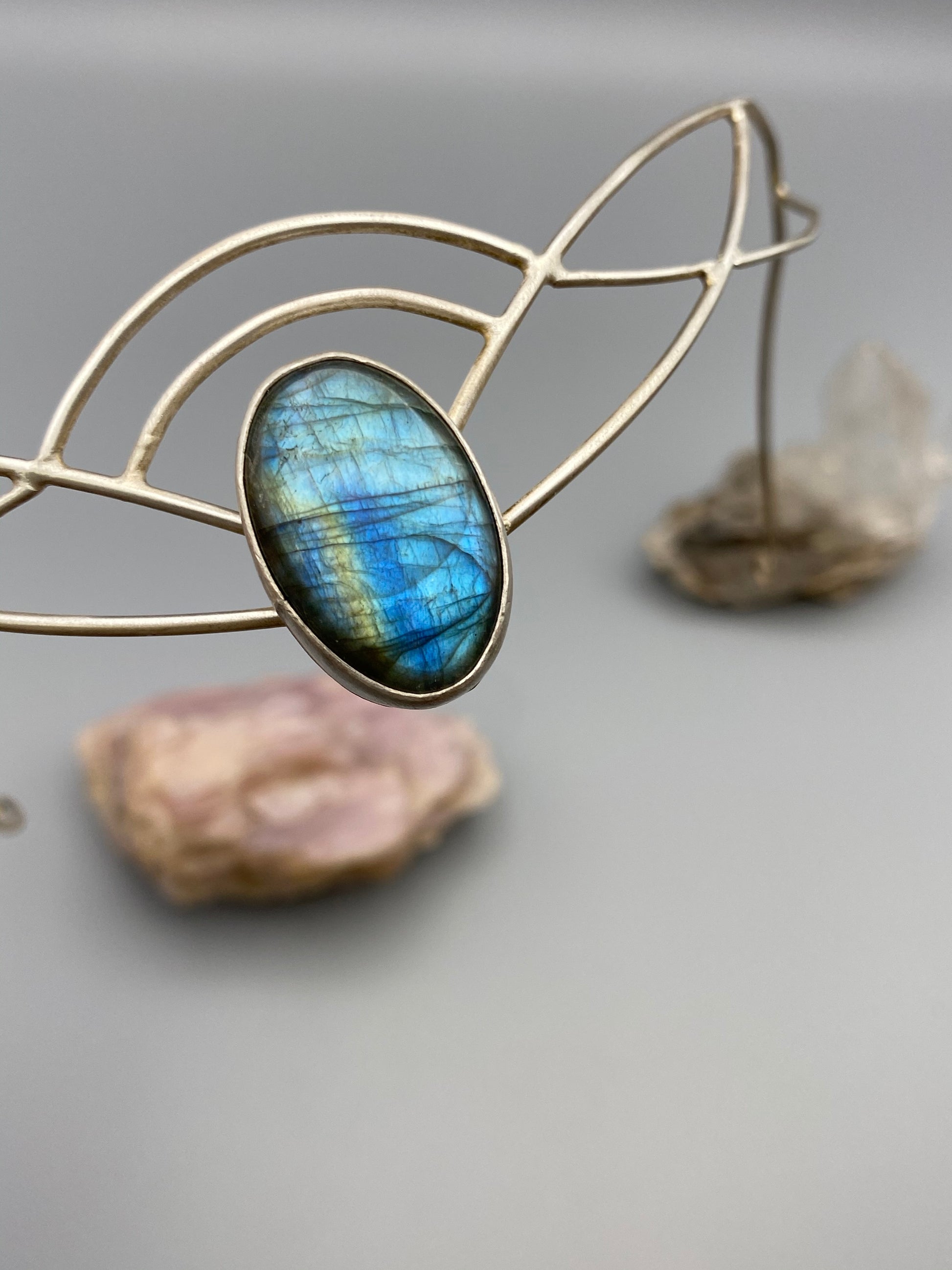 sturdy sterling silver crown with stunning labradorite cabochon set in fine silver. ties in back with leather cording, so it's super stable when moving or dancing! wear it however you'd like- flipped in either direction, across the forehead, or up along the hairline. choice of brown or black leather cord.